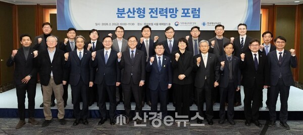 ‘2026 분산형 전력망 활성화 포럼’이 20일 오전 10시 롯데호텔 서울 에메랄드홀에서 한국에너지공단과 공동 주최로 열리고 있다. 2024년 분산법 시행 이후 변화된 전력 시장의 현황을 점검하고 지역 단위의 자립형 에너지 시스템 구축 방안을 모색하기 위해 열린 이날 포럼에서는 차세대 전력망 구축을 위한 공공기관 MOU와 켄텍, 지스트 등 주요대학이 인재양성 협약을 체결했다. 김성환 기후부장관(우측 6번째), 이유진 청와대 기후비서관(우측 5번째), 김동철 한전사장(우측 4번째), 전력거래소 김홍근 이사장 직무대행((우측 3번째), 최재관 에너지공단 이사장(우측 2번째) 등 주요인사들이 기념촬영을 하고 있다.